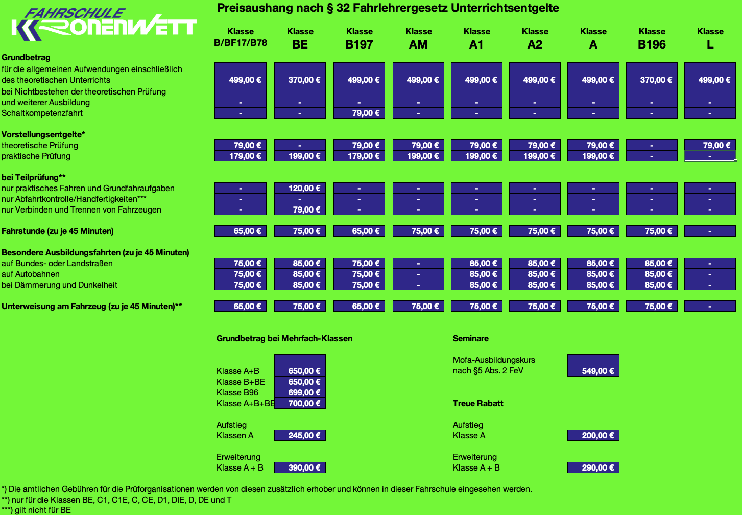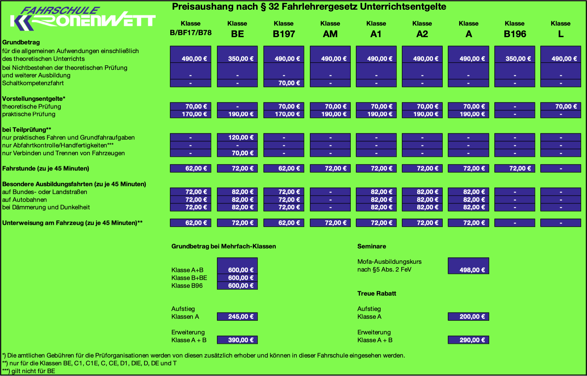 Preisaushang nach § 32 Fahrlehrergesetz Unterrichtsentgelte